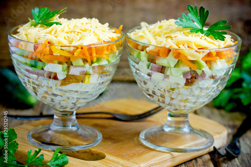 Festive layered salad serving in glass from smoked chicken fillet, egg, cucumber, carrot, potato and cheese