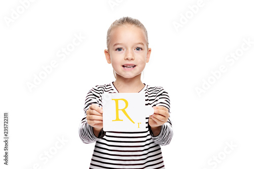 Young girl holding a card with letter R. Speech therapy concept on white background. Correct pronounciation and articulation at preschool age.
