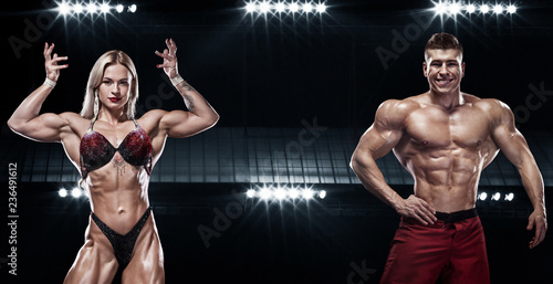 Bodybuilding competitions on the scene. Men and women sportsmens and athletes. Black background with lights.
