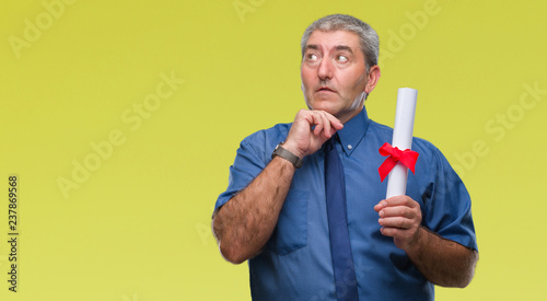 Handsome senior man holding degree over isolated background serious face thinking about question, very confused idea