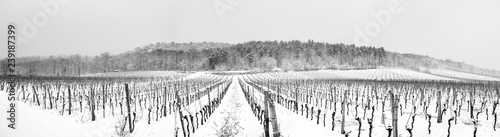 Panorama verschneiter Weingarten im Winter mit kleinem Wald auf einem Hügel