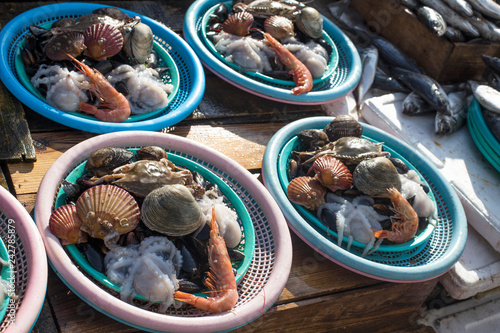 shellfish and other seafood in fish market.(Sale of Fresh clams, mussels, prawns, octopus)