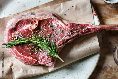 Raw tomahawk on a wooden board food photography recipe idea