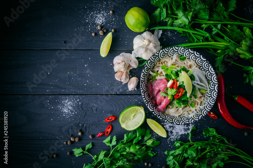 Pho Bo vietnamese soup with noodles, beef, chili pepper, onion, cilantro and lime on dark black background