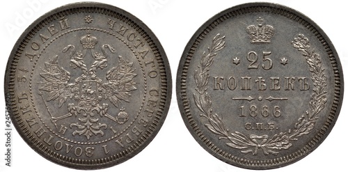 Russia Russian silver coin 25 twenty five kopecks 1866, rare date, crowned eagle with two heads holding scepter and orb, shield with St George on chest, value and date flanked by laurel and oak branch