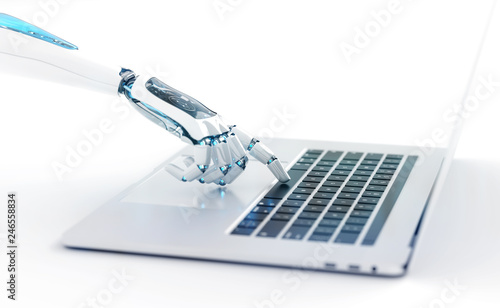 White robot cyborg hand pressing a keyboard on a laptop 3D rendering