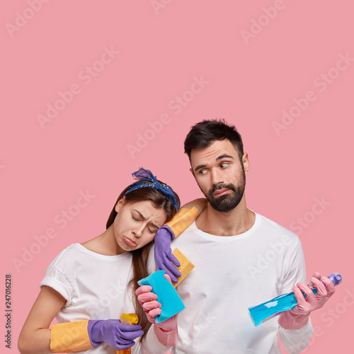 Shot of grieved woman has tired facial expression, leans at shoulder of husband, hold sponges and detergents, isolated over pink background with empty space for your promotional text. Cleaning
