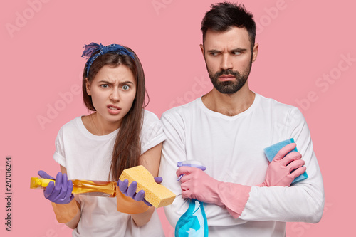 Upset dissatisfied woman frowns face, holds sponge and cleaning agent, annoyed gloomy guy with thick stubble carries cleanser, work as team of cleaning service, isolated over pink background