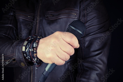 Man hand holding microphone. Leather bracelet and accessory .Hard rock, heavy metal,gothic and punk style.Brutal jacket