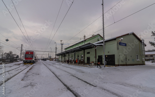 Lipany station in winter snow morning with trains and platforms