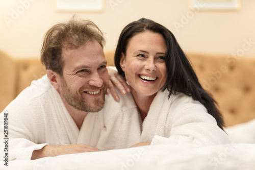 Front view of happy wife and husband lying on bed, laughing, hugging each other and looking away. Cheerful male and female in white robes relaxing together in morning in hotel. Concept of happiness.