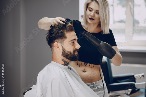 handsome young bearded guy sitting in an armchair in a beauty salon and the girl around him dry his hair