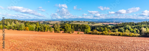 Typical red soil of countryside around Nova Paka. Agricultural Landscape with Giant Mountains on the background. Czech Republic