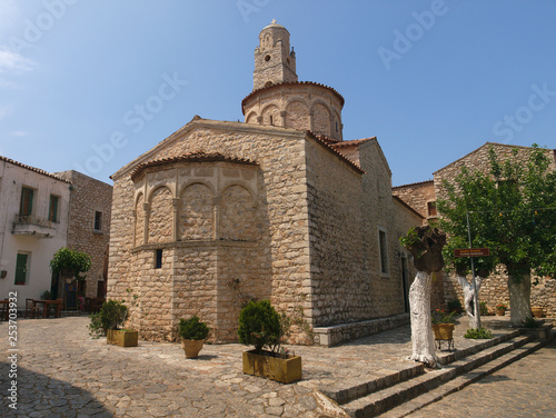 Old byzantine orthodox church in a Greek Village under blue sky