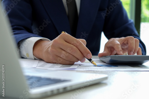 Businessman hand works on a calculator and uses a pen pointing at the graph.
