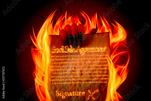 Pact to sell your soul to Lucifer, strike a Faustian bargain or deal with the devil concept theme with Satan holding in creepy ugly red hand with claws burning scroll with fiery text written in flames
