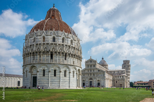Wide angle view of Romanesque Baptistery of St. John Baptistry at Piazza dei Miracoli Piazza del Duomo popular tourist attraction in Pisa, Italy
