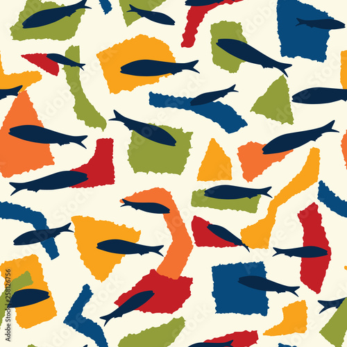 Sardine fish swimming seamless vector pattern. Lisbon St Antonio traditional portugese food festival grilled fishes. June Portugal street party . Atlantic ocean animal symbol. Isolated fishing tourism