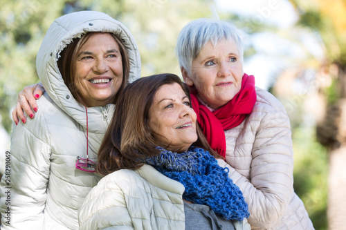 gruppo di trea amiche mature ridono felici con i piumini bianchi in un parco