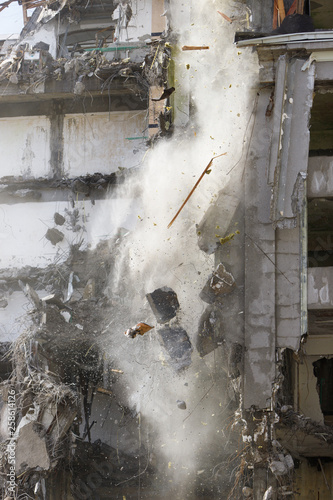 Destruction/demolition of reinforced concrete building, falling debris, closeup.