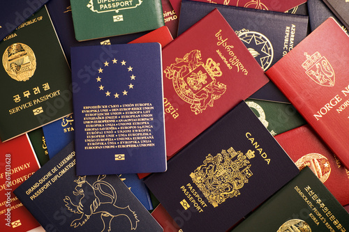 Mixed biometric passports of many countries of the world. In the foreground is a European Union passport.