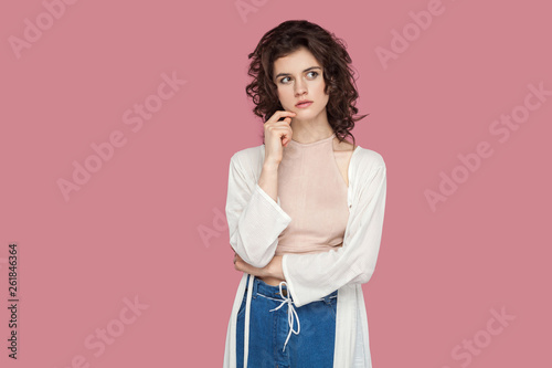 Portrait of thoughtful brunette young woman with curly hairstyle in casual style standing, touching her chin, looking away and thinking what to do. indoor studio shot isolated on pink background.