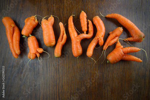 Raritäten: Ungenormte Bio Möhren mit Händen und Beinen auf Holznen aus dem Garten