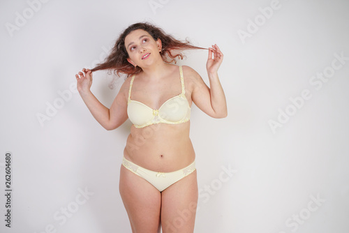cute chubby woman in yellow fashion lingerie touching her hair on white background in Studio