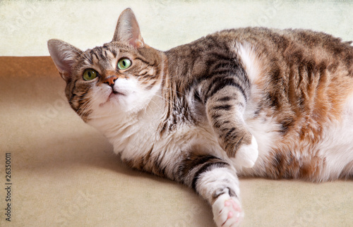 Dicke Katze auf dem Boden liegend