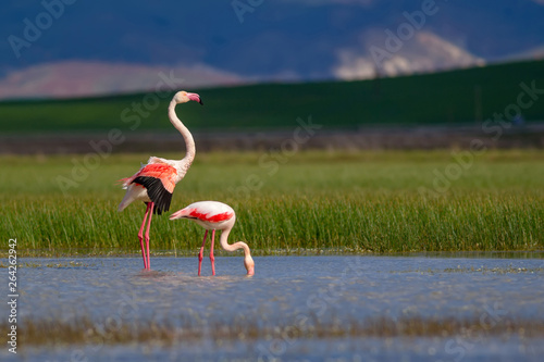 Nature and birds. Bird: Greater Flamingo. Phoenicopterus roseus. Green blue nature background.