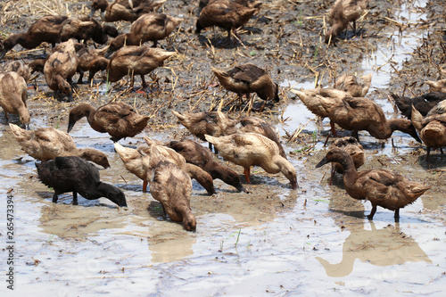Flocks of ducks raised in the fields are scrambling for food.
