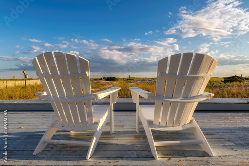 Beach chair on Cape Cod beach at sunset, Cape Cod, Massachusetts, USA.
