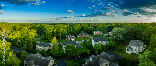 American luxury real estate single family houses with brick facade and two car garages in a new construction Maryland street neighborhood USA aerial view