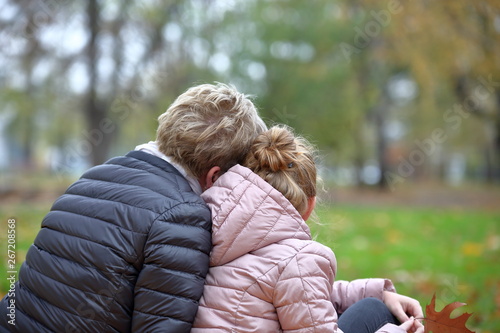Mama z córką siedzą, objęte, przytulone, w parku, tyłem