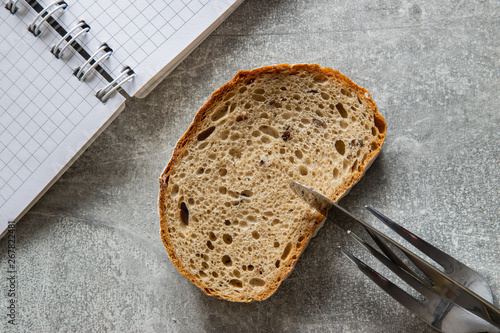 Nóż, widelec, bochenek chleba notes na betonowym tle