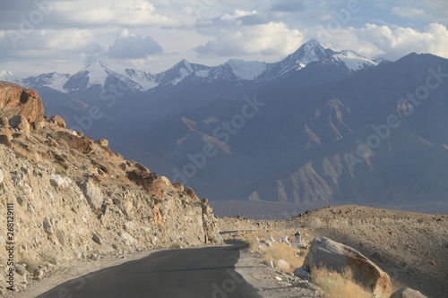 asfaltowa droga biegnąca po górskim zboczu wśród nagich skał w nepalu z himalajami w tle