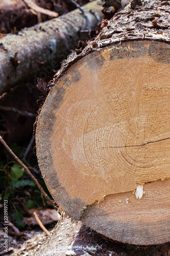 Vertical photo tree cut down cracked pine trunks of bark brown close-up