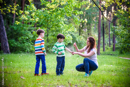 Young woman mother applying insect repellent to her two son before forest hike beautiful summer day or evening. Protecting children from biting insects at summer. Active leisure with kids