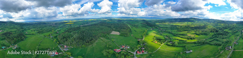 Aerial wide panoramic view on sudety mountains with touristic city in the valley surrounded by meadows, forest and rapeseed fields