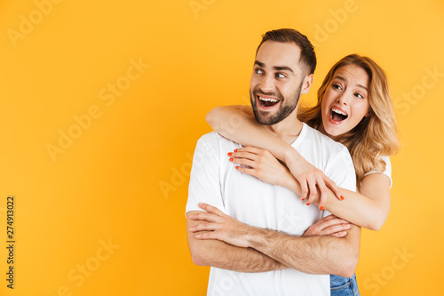 Image of impressed couple man and woman expressing wonder while looking aside at copyspace