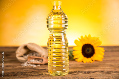Sunflower oil in a bottle and sunflower flowers and sunflower seeds in a sack
