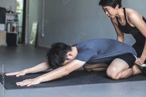 Young woman practicing yoga in gray background.Young people do yoga indoor