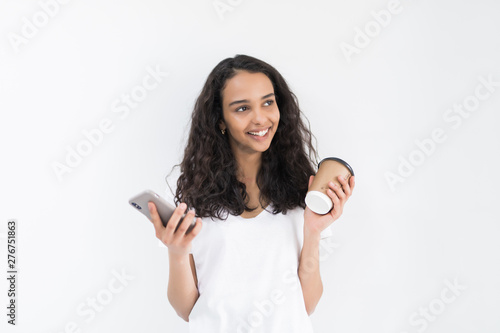 Portrait of a satisfied young woman using mobile phone while holding cup of coffee to go over white background