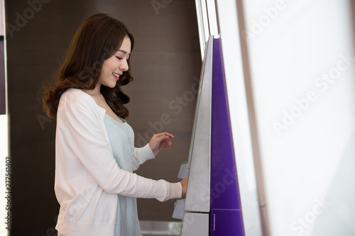 Young Asian woman withdrawing money with a card at the automatic machine, Female standing at ATM of the bank