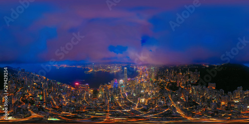 360 panorama by 180 degrees angle seamless panorama view of aerial view of Hong Kong Downtown. Financial district and business centers in technology smart city. skyscraper and buildings at night.