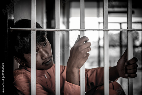 Asian Men desperate to catch the iron prison,prisoner concept,thailand people,Hope to be free.