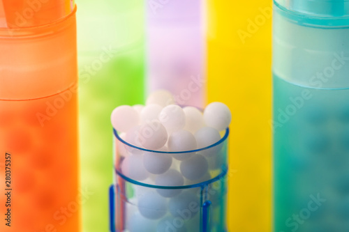 Modern Color homeopathic pills in plastic container on black background