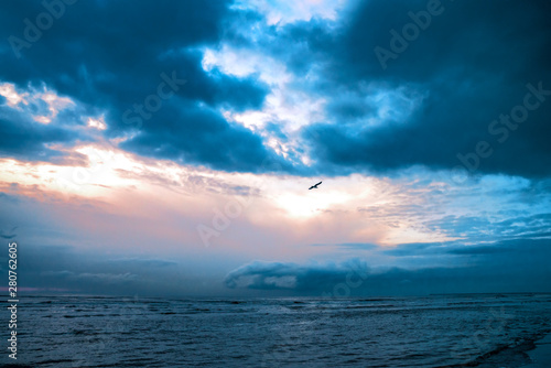 Gewitterwolken mit Abendrot und einen Vogel am Meer