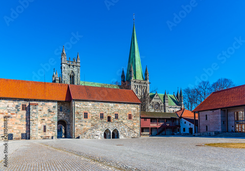 Nidaros cathedral viewed from courtyard of archbishop's palace in Trondheim, Norway