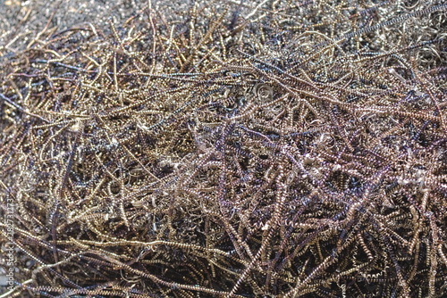 Spiral-cut pieces of metal shavings from a metal cutting machine. Recycling waste machining. Recycling of metals.
